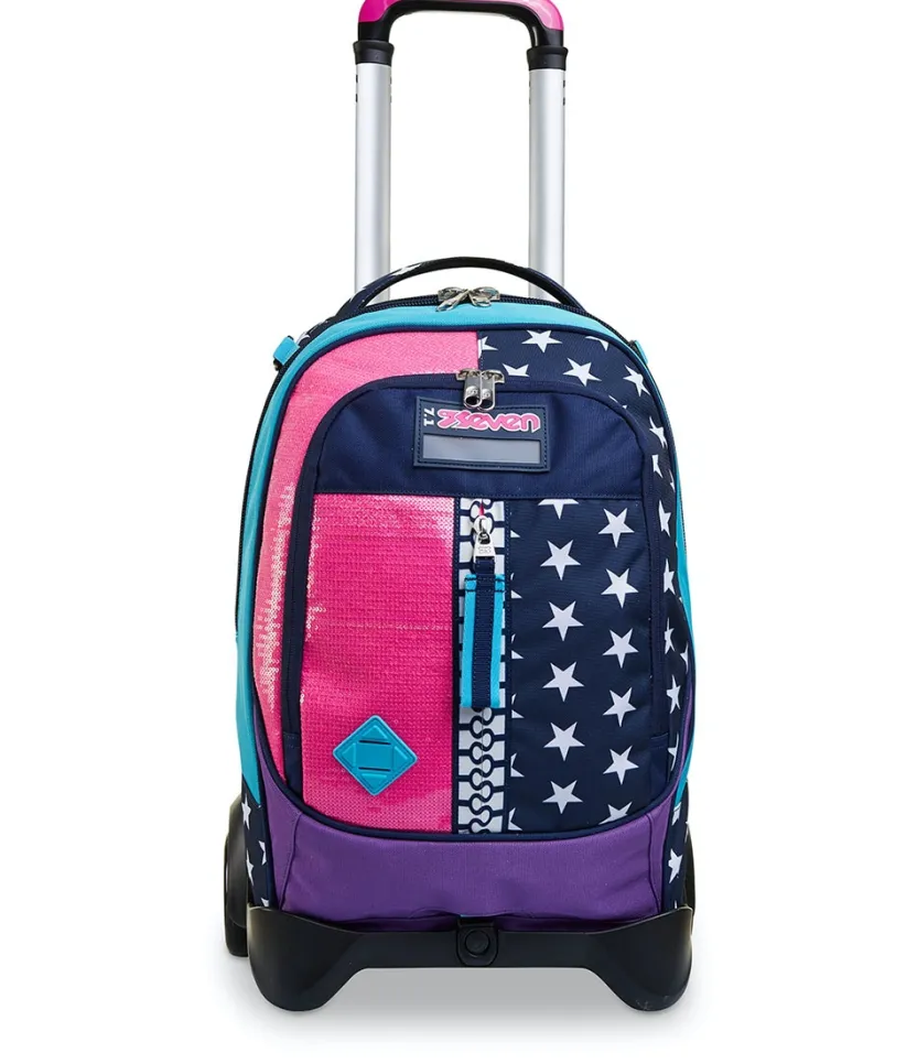 Il Trolley Seven Jack-2Wd Pinking Blue, Con Inserti In Paillettes, Patch E “Maxi Zip”Stampata, Unisce Stile E Versatilita. In Poche Semplici Mosse, Infatti, Da Trolley Diventa Zaino E Viceversa. Il Carrello Ha Fondo Rinforzato E Protezioni Angolari, Dando Stabilita Al Trolley E Protezione Al Contenuto. Lo Sganci E Hai Uno Zaino Lavabile, Maxi Capiente, Dotato Di Tasca Frontale E Comodo Da Indossare Grazie A Schienale Imbottito E Spallacci Imbottiti E Traspiranti. Spallacci Che, Se Lo Usi Come Trolley, Possono Essere A Scomparsa O, Grazie Al Crossover System, Sollevarsi Automaticamente Tirando Su La Resistente Doppia Barra Telescopica Con Due Regolazioni In Altezza, Evitando Che I Nastri Striscino A Terra. Infine Con Le Maxi Ruote Da 10 Cm Trascinare Il Trolley Seven Jack-2Wd Pinking Blue Lungo Tutti I Percorsi Della Tua Giornata E Facilissimo.