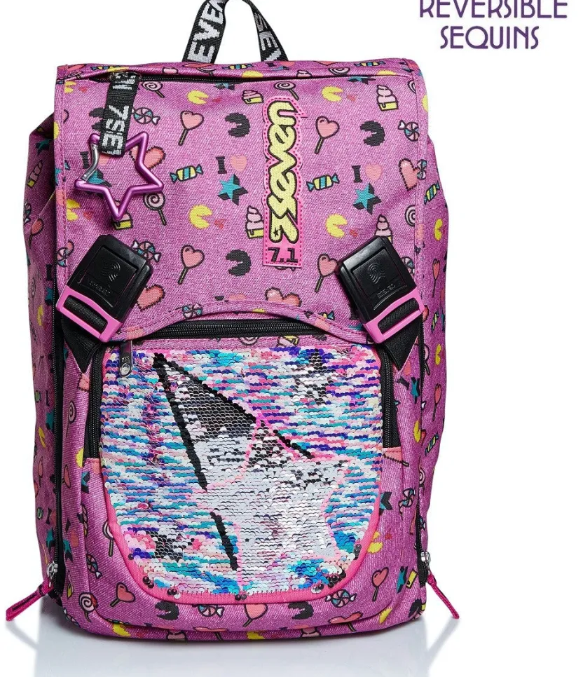 Lo Zaino Estensibile Seven New Design Starry Rainbow Ha Un Look Cool E Alla Moda Che Puoi Cambiare Grazie Alle Paillettes Reversibili. E Poi Ha Tanto Spazio Che Puoi Moltiplicare Con La Zip Laterale Quando Il Carico Si Fa Pesante. In Piu Ha Un’Ampia Tasca Frontale E Le Fibbie A Sgancio Rapido Per Il Massimo Della Praticita. Dotato Anche Di Moschettone Staccabile, E Ideale Per Affrontare Le Tue Giornate Piene Di Impegni. Lo Schienale Ergosystem Preformato Con Fondo Integrato E Gli Spallacci Imbottiti E Traspiranti Lo Rendono Leggero E Confortevole Da Indossare Anche Quando E Davvero Pieno, Proteggendoti La Schiena. E Con Gli Inserti Rifrangenti Sarai Piu Visibile Per La Tua Sicurezza.